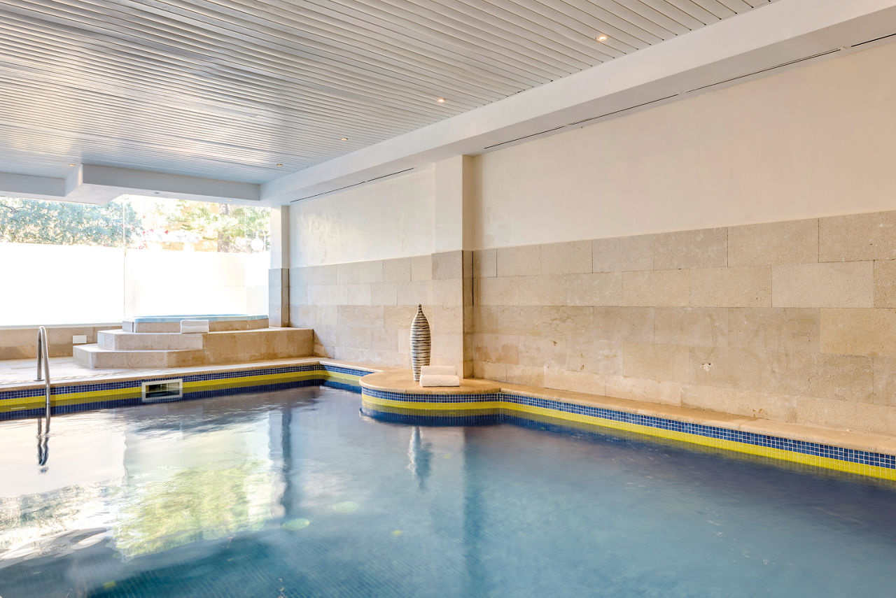 The outdoor swimming pool is free-form and has a lovely natural look to it. The indoor pool is heated when required.
