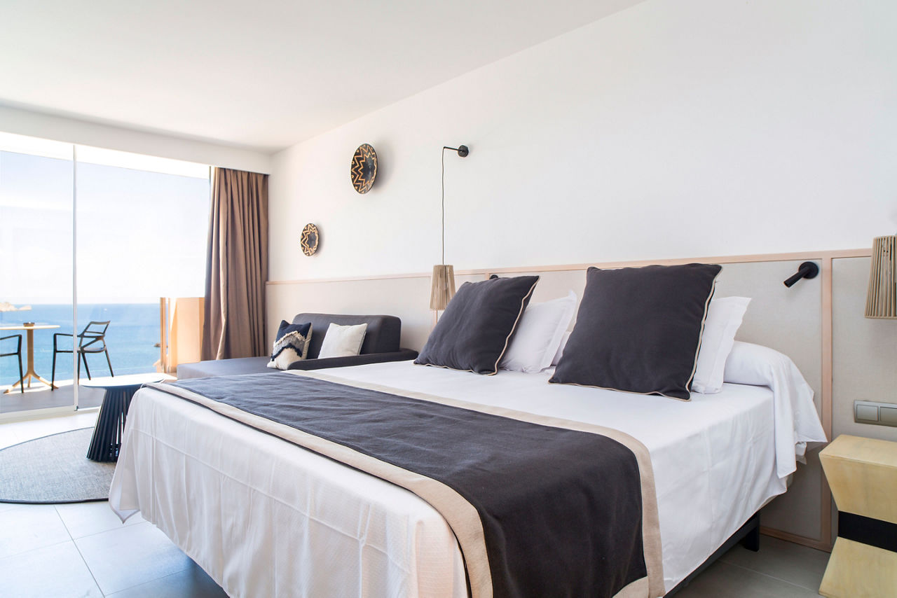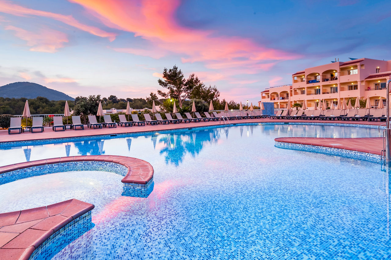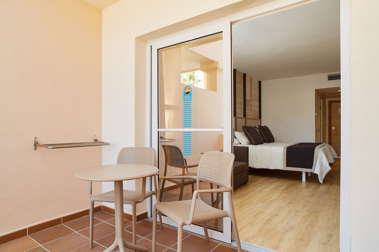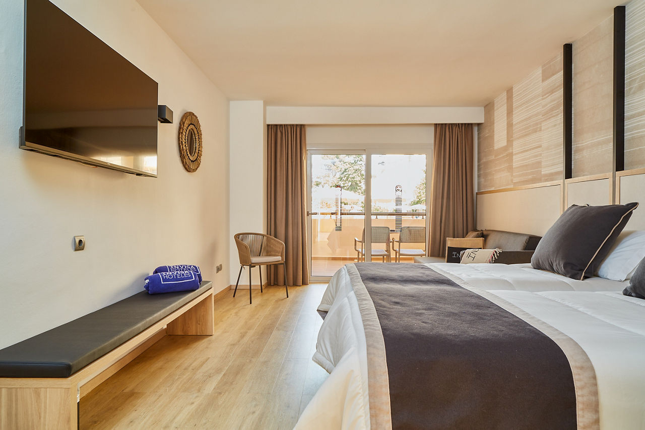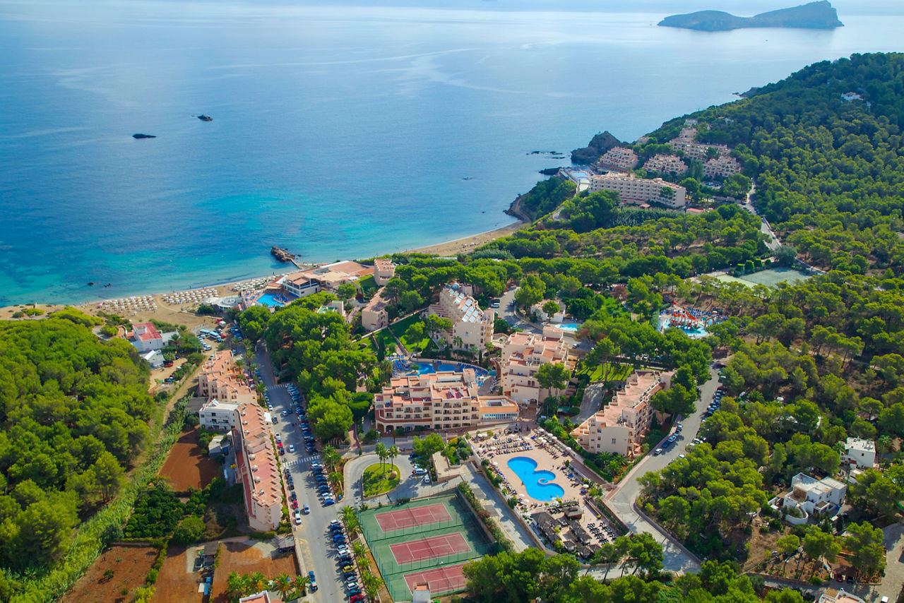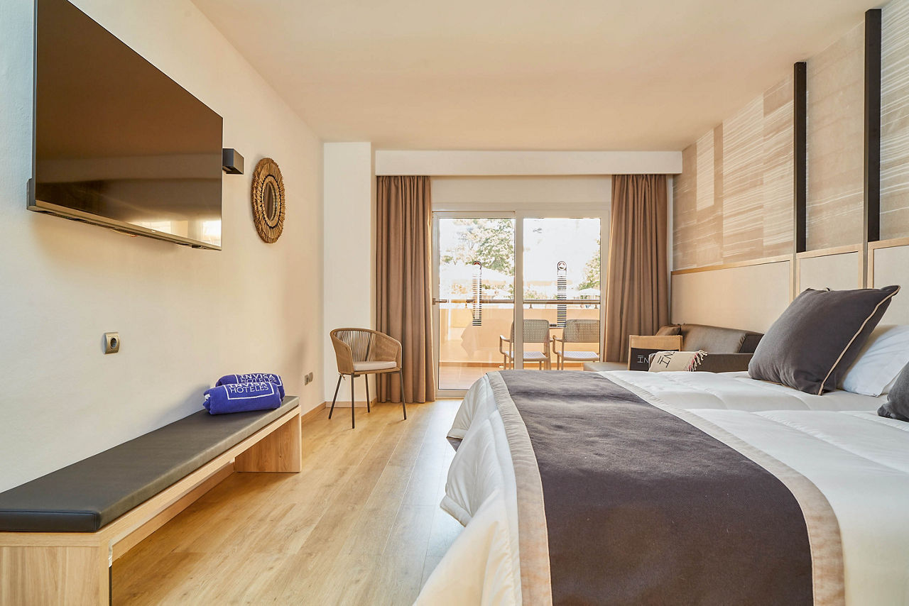 The Invisa Figueral Resort is a spacious property spread across two blocks. This large resort boasts spectacular views of the bay of Playa Es Figueral from its hillside location and a short walk downhill will bring you to a beautiful sandy beach. All the ingredients for a great holiday are here in resort including a range of room types for all budgets, a host of activities and facilities across the two hotels that kids, couples and families will love. The Pirates? Island water activity zone is a wonderful way for kids of all ages to spend the day, while adults have their own chill out area as well as an adults only bar area. The Invisa Figueral Resort is perfect for a fantastic All Inclusive holiday in Ibiza!Double and Twin rooms sleep up to 3 adults and 1 child and have bathroom containing a bath with shower attachment, air conditioning, hairdryer, flat screen television, fridge, kettle and a balcony or terrace. Premium and Premium Family rooms sleep up to 3 adults and 1 child or 2 adults and 2 children, all have the same facilities but have been refurbished and have walk in showers. Junior suites sleep up to 3 adults and 2 children, all have 2 flat screen televisions, new furnishings, and a coffee making machine. Sea View rooms and Gran Premium Family rooms sleep up to 4 adults and 2 children are also available. Please note: guests can be located in either parts of the hotel.