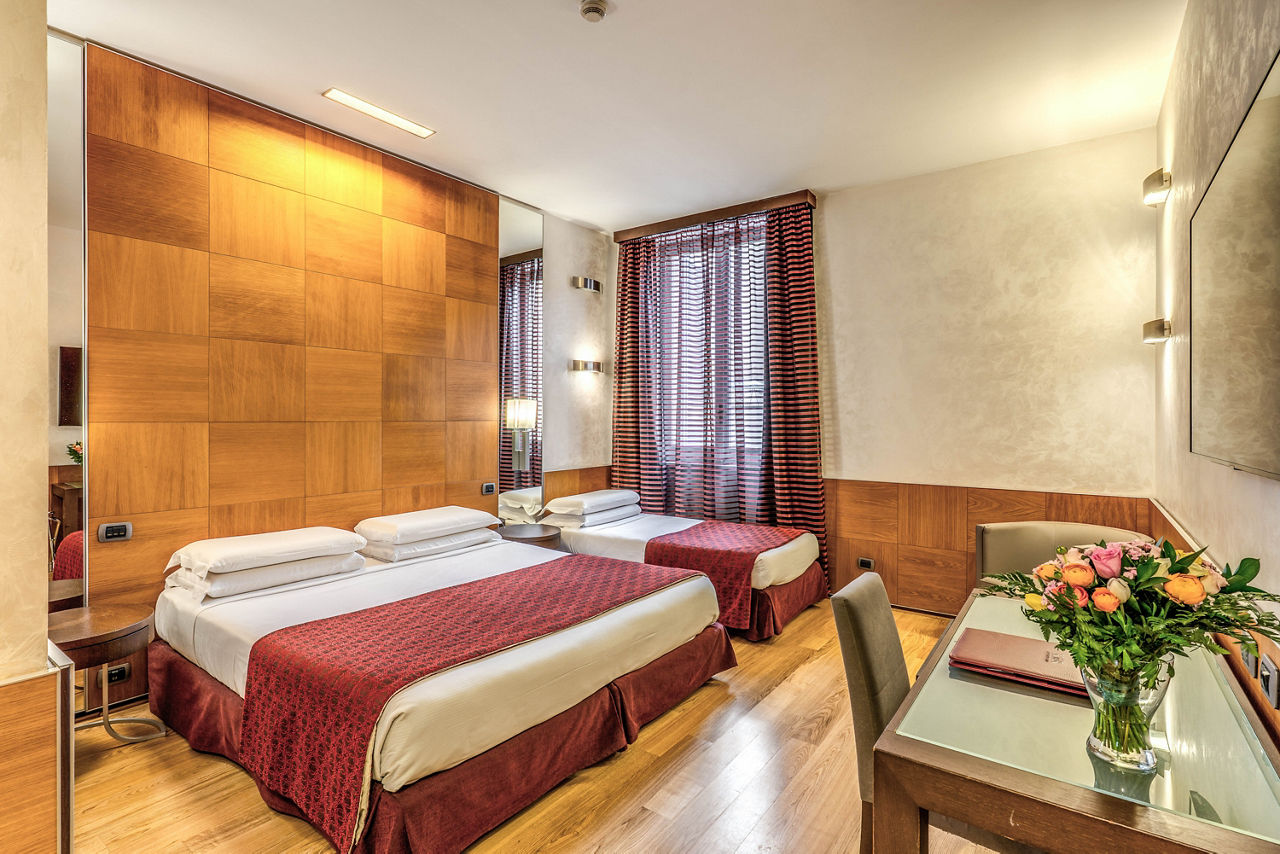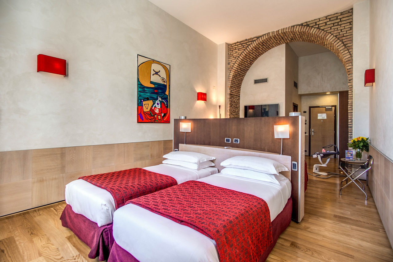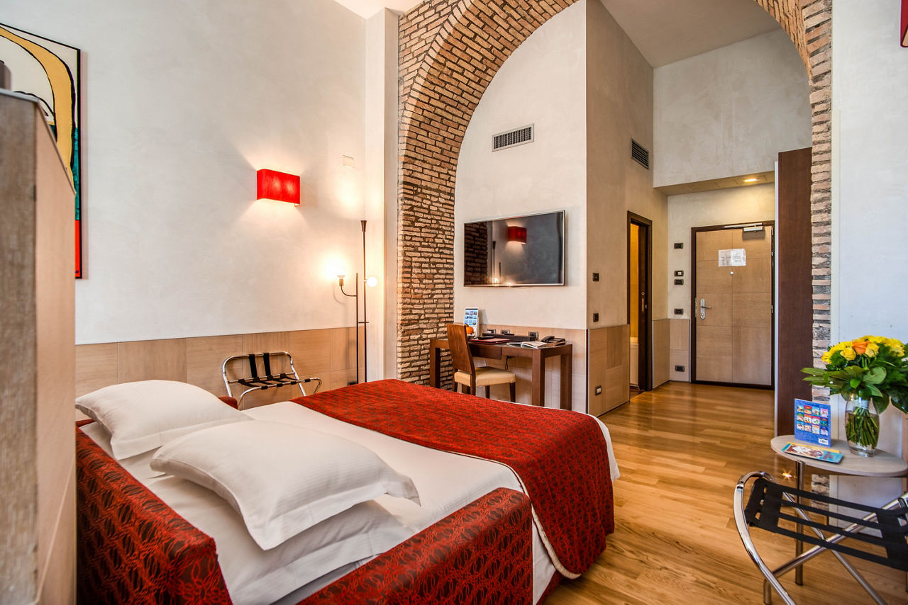At the foot of Palatine Hill and close to the Roman Forum, the Hotel Kolbe puts you right in the historic centre of Rome. With parts dating back to 1625, the hotel has a great mix of historical features such as the exposed brickwork and modern, effortless style. After full days of sightseeing, you'll find elegant and comfortable rooms plus an internal courtyard garden for relaxation in the summer. The famous Mouth of Truth featuring in the film 'Roman Holiday' is moments away, this is also perfectly placed for exploring the Colosseum and the Trastevere districts for its restaurants and bars.Standard Double or Twin rooms sleep up to 2 adults and have bathroom containing a bath or shower, air conditioning (01 May-31 Oct), hairdryer, minibar*, flat screen television and safety deposit box. Room upgrade options and Sole Use rooms are also available.