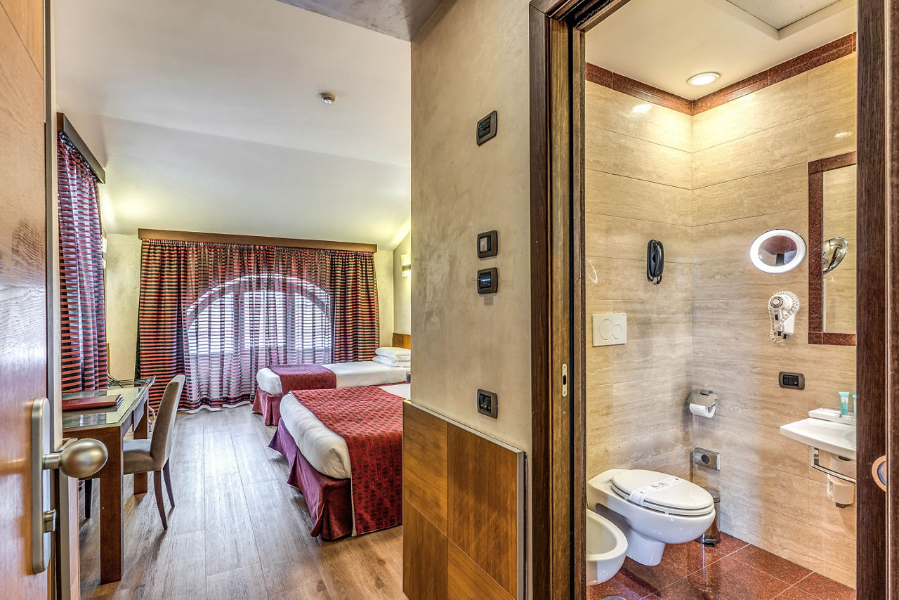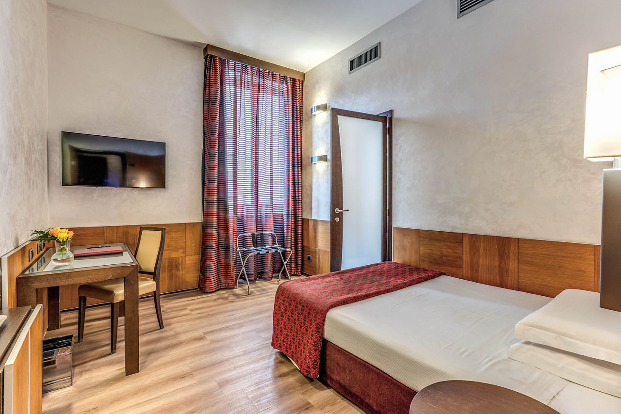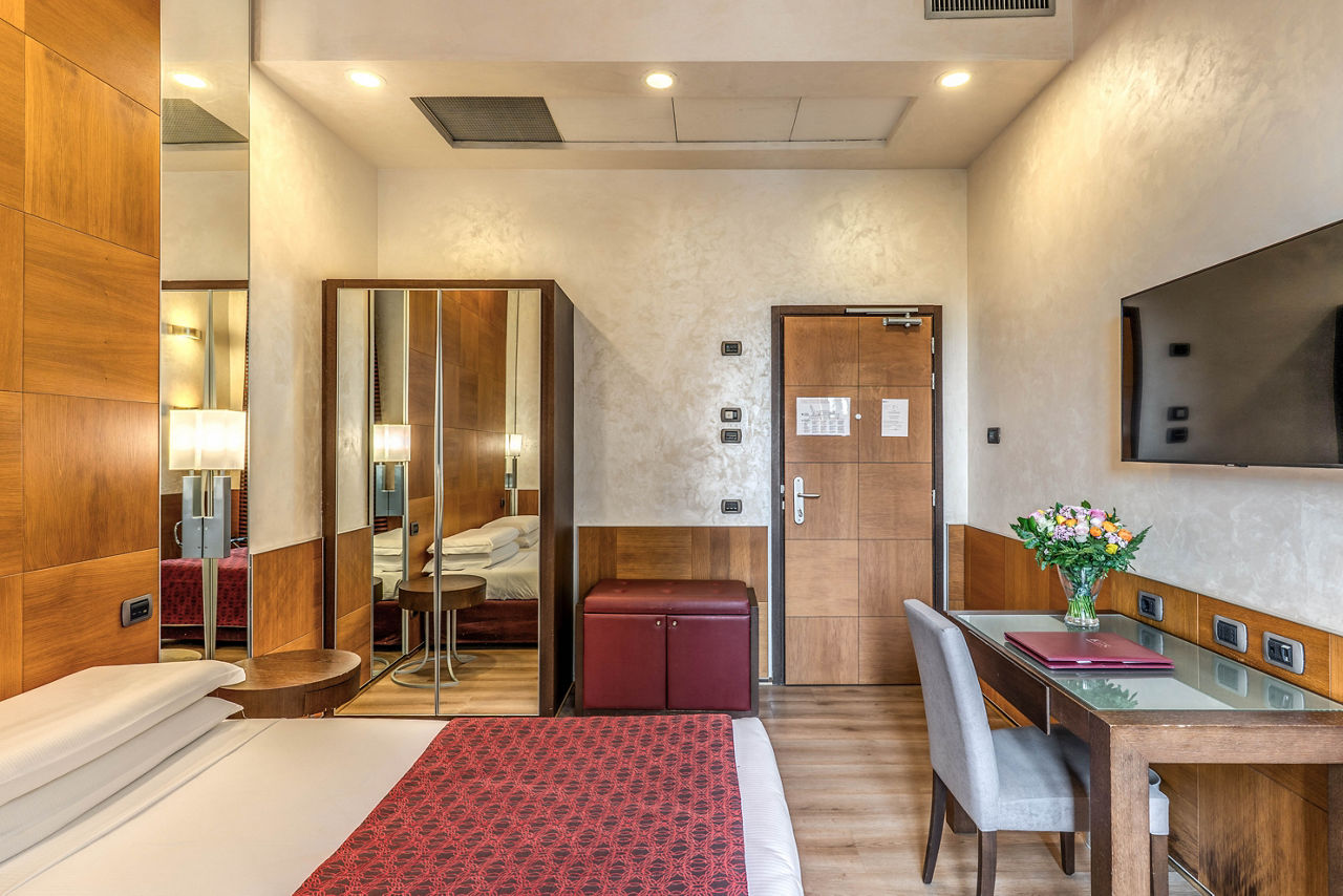 At the foot of Palatine Hill and close to the Roman Forum, the Hotel Kolbe puts you right in the historic centre of Rome. With parts dating back to 1625, the hotel has a great mix of historical features such as the exposed brickwork and modern, effortless style. After full days of sightseeing, you'll find elegant and comfortable rooms plus an internal courtyard garden for relaxation in the summer. The famous Mouth of Truth featuring in the film 'Roman Holiday' is moments away, this is also perfectly placed for exploring the Colosseum and the Trastevere districts for its restaurants and bars.Standard Double or Twin rooms sleep up to 2 adults and have bathroom containing a bath or shower, air conditioning (01 May-31 Oct), hairdryer, minibar*, flat screen television and safety deposit box. Room upgrade options and Sole Use rooms are also available.