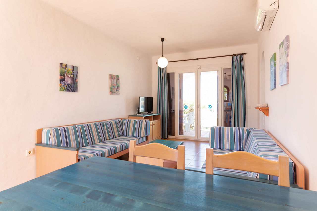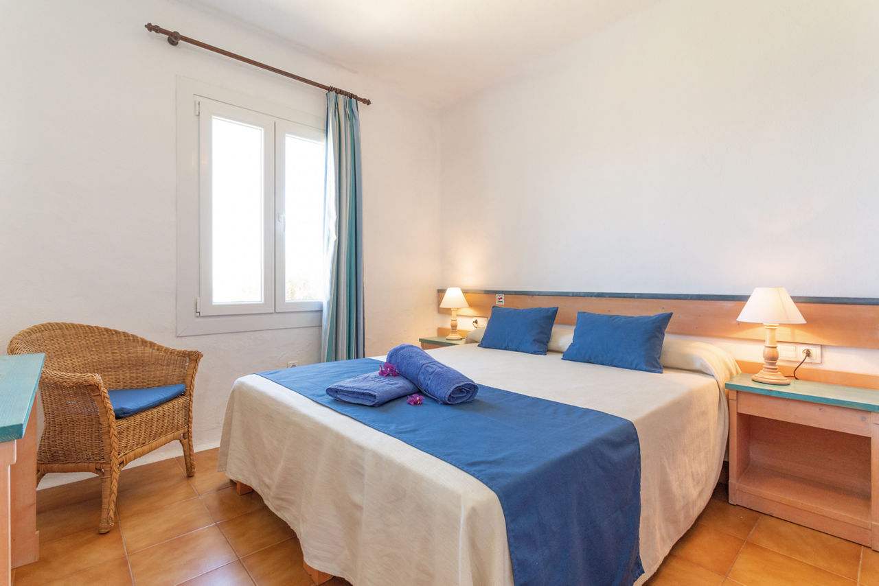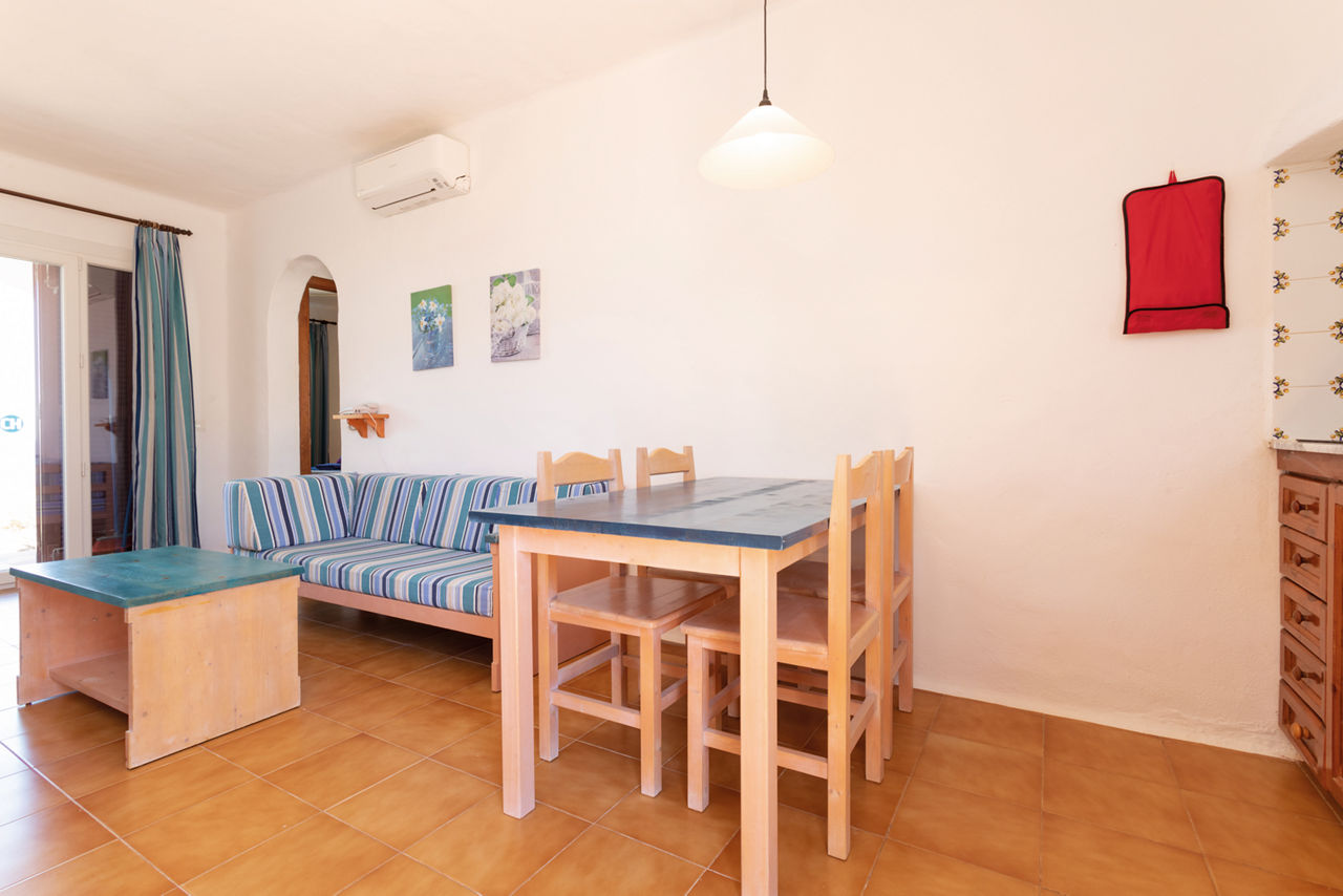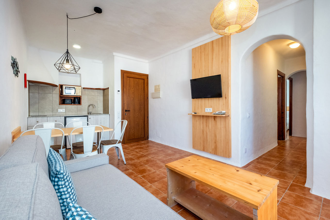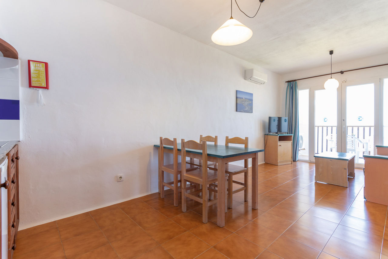 These well-equipped apartments set up in the style of a Menorcan village offer a relaxing holiday in the equally relaxing resort of Playa de Fornells. Families, couples and friends looking for flexible accommodation including a range of board options and a variety of apartments including larger three bedrooms, will love it here. Thanks to the cliff-side location you can enjoy far reaching views out to sea and of the stunning sunset from the chill-out area and outdoor dining area. If you book a superior apartment you can enjoy the sea view from your very own balcony. For those wanting to explore the beautiful island, meals can be taken at the sister hotels (reservation required), Isla Del Aire Apartments in Punta Prima or at Floramar Aparthotel in Cala Galdana. With all this on offer, you really can fit everything into your next holiday to Menorca!One bedroom apartments sleep up to 3 adults and 1 child and have a bathroom with shower, satellite TV, kitchenette, fridge and balcony or terrace. Two bedroom apartments sleep up to 4 adults and 2 children, 3 bedroom apartments with pool view sleep up to 6 adults and 1 child. Superior one and two bedroom apartments with sea view are also available.