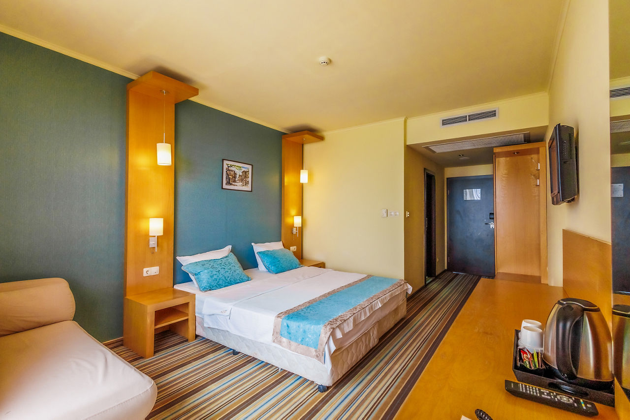 With a fantastic location on the beachfront and only a short walk away from Nessebar resort centre, Hotel Mirage is the perfect choice if your looking for a beach holiday close to all of the action. You'll have the privilege of choosing to spend your days around the relaxing pool area with panoramic sea views, or soaking up the sun on the sandy beach.Twin rooms sleeps up to 3 adults and have bathroom containing a bath or shower, air conditioning, television and balcony. Sole Use rooms are also available.